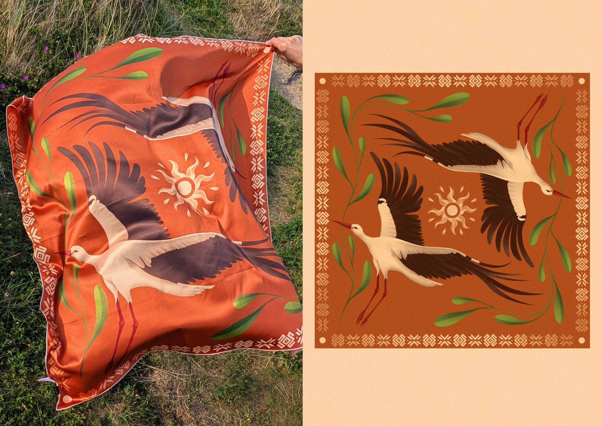 This project is based around motifs from Baltic culture; I am fascinated how these symbols have been preserved through history and still hold their meaning and storytelling qualities. Storks in Baltic culture are a strong symbol of protection on the home, luck, fertility and spring. The surrounding repetitive elements hold the meaning of the star and cancer with all the design details circling around the central element of the sun.